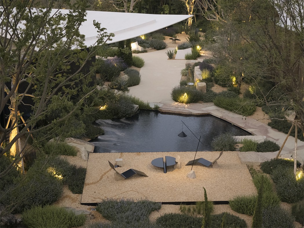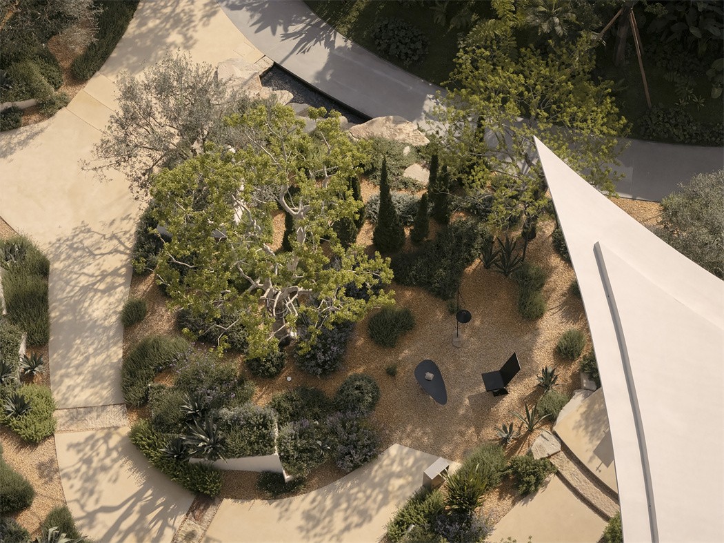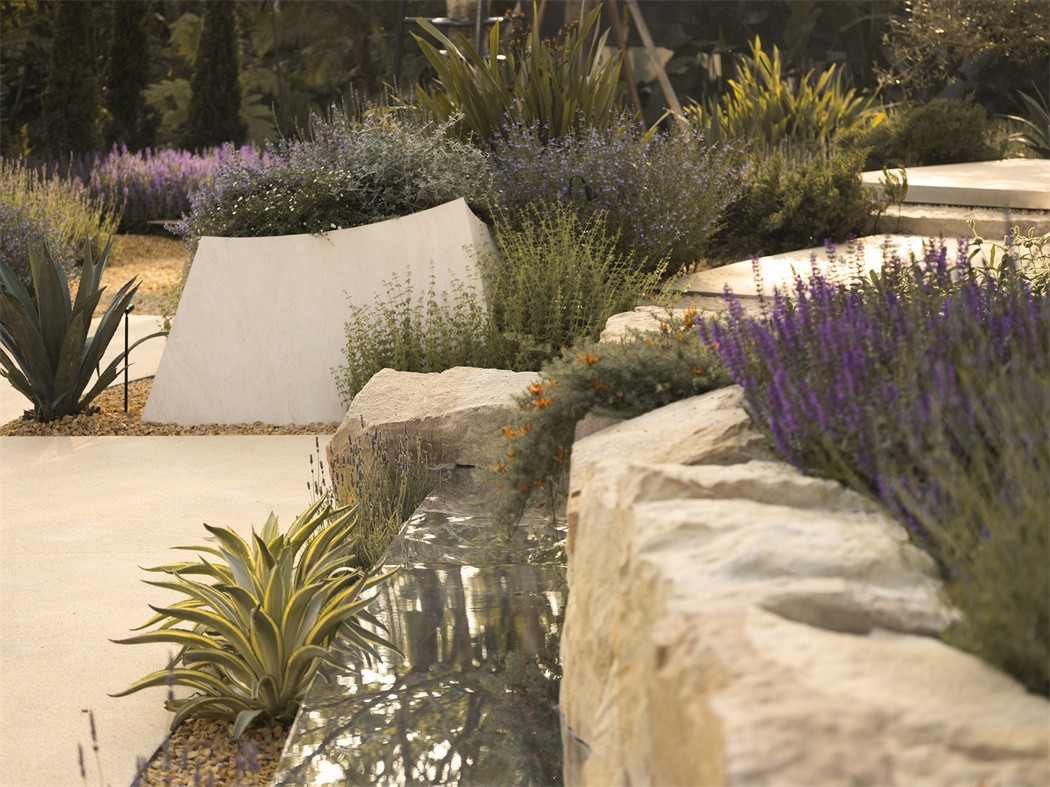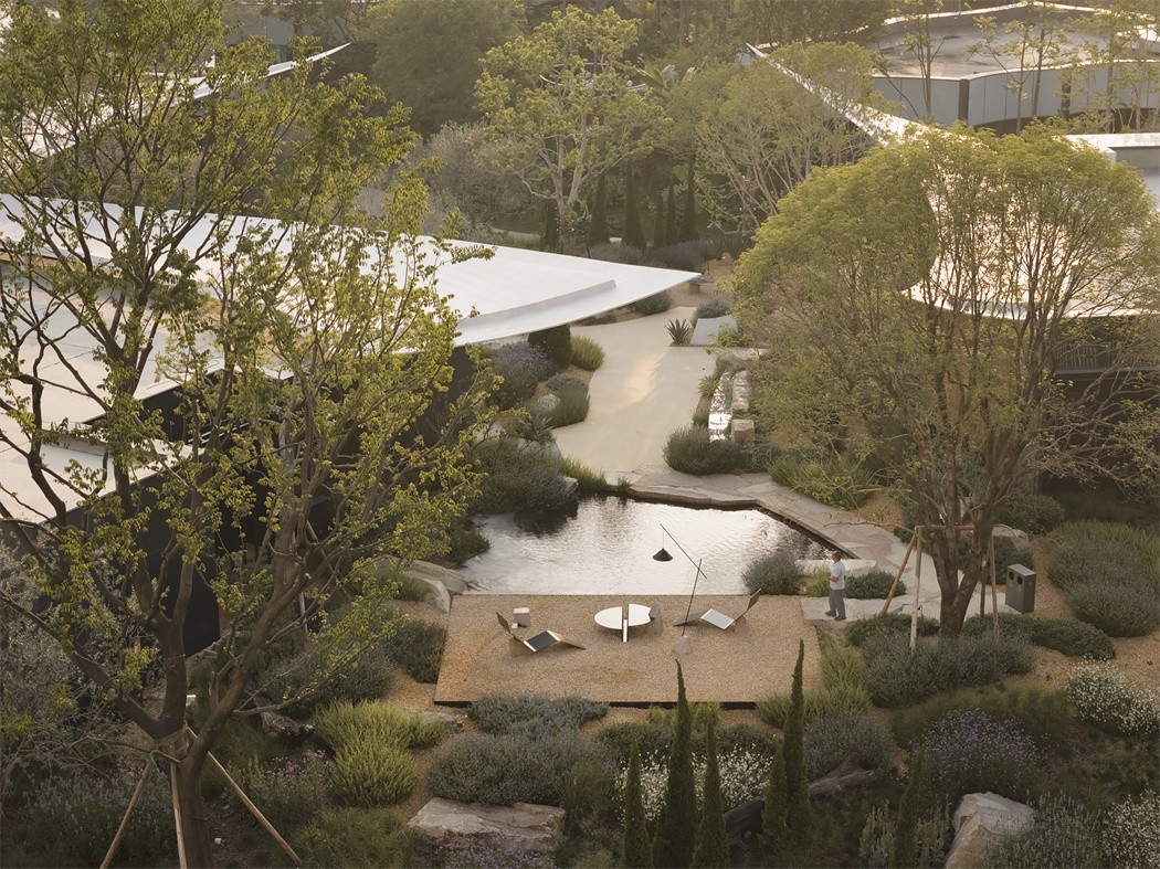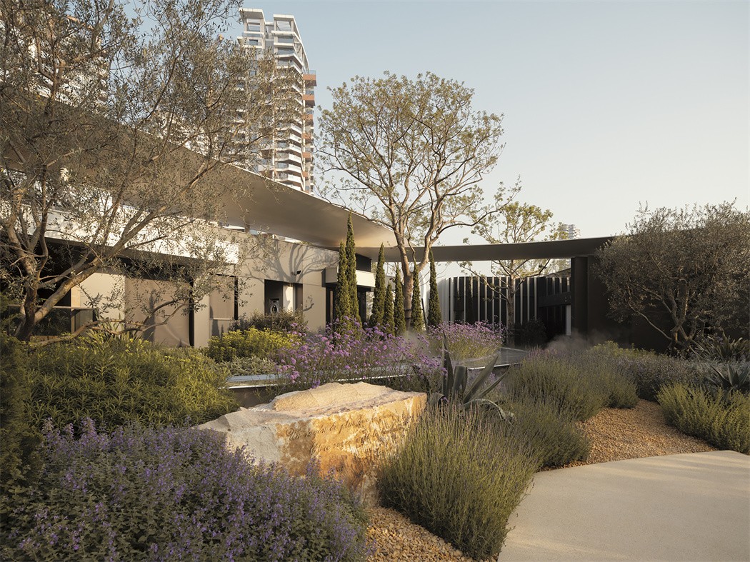 同时通过独特的植物配置,选用铁冬青、油橄榄、龙柏、菲油果等多种植物,构建南法地中海风情植被体系,营造出浪漫、松弛的氛围;在色彩和层次搭配方面,通过薰衣草紫与柏坡黄、光亮蓝蓟与鹦鹉嘴百脉根等补色穿插运用,以及龙舌兰与墨西哥飞蓬等对画面饱和度的调节,结合龙柏、澳洲米花等对明暗色调的处理,形成色彩和谐、主次分明的植物景观。