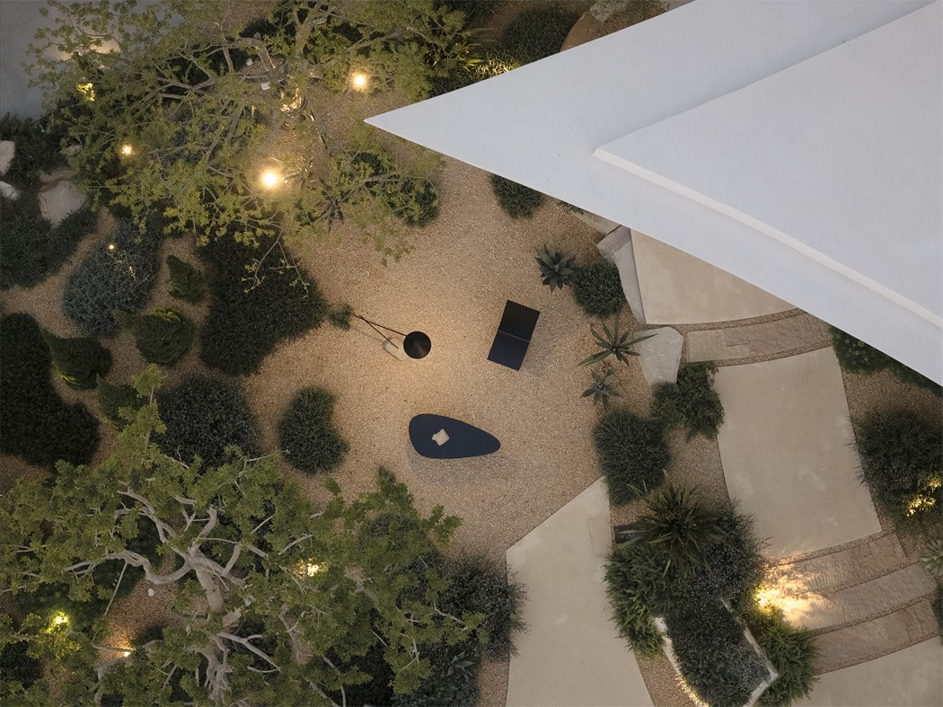 通过采用“天际花环”设计——以桁架为整体结构,上部块面采用镜面表皮,将花境植被的生机延伸至半空,仿佛将自然之美托举向天际;下部则以翻转形态形成二次反射,消弭了桁架柱梁的厚重感,使其如悬浮于建筑之上的艺术精灵,灵动而富有张力。