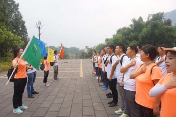 野外徒步的当天清早,教练按小组分好路上的补给物,随后带领我们徒步1.5公里进行热身,到达楠木溪红军纪念馆,进行出征仪式。